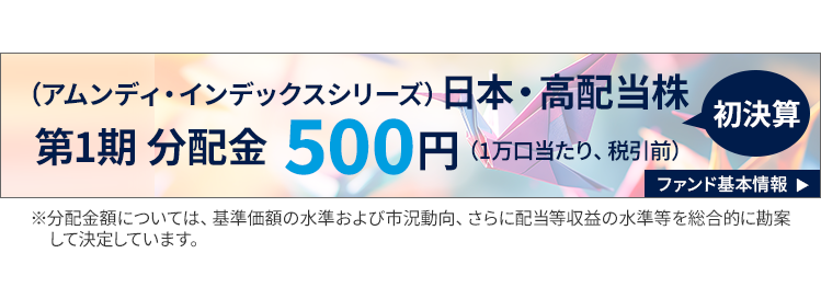 ・ 当ページは、アムンディ・ジャパン株式会社(「当社」)が日本の居住者の皆様を対象として設定・運用を行う国内投資信託の情報提供を目的として、当社が作成したものであり、法令等に基づく開示書類ではありません。また、当ページに含まれるいかなる特定の金融商品取引の勧誘を目的とするものではありません。 ・ 当ページは、信頼できると考えられる情報に基づいて作成しておりますが、その正確性、完全性を保証するものではありません。 ・ 当ページに記載されている運用実績等に関わる数値・グラフ等はあくまでも過去の実績であり、将来の運用成果等を示唆または保証するものではありません。また、手数料・税金等を考慮しておりませんので、実質的な投資成果を示すものではありません。 ・ 当ページに記載されている内容・数値・図表・意見・予測等は作成時点のものであり、将来の市場動向、運用成果を示唆・保証するものではなく、予告なしに変更される可能性があります。 ・ 投資信託は、株式など値動きのある有価証券(外貨建資産には、当該外貨の円に対する為替レートの変動による為替変動リスクもあります。)に投資しますので、基準価額は変動します。投資元本が保証されているものではありません。投資信託の基準価額の下落により、損失を被り投資元本を割り込むことがあります。投資信託の運用による損益はすべて投資者の皆さまに帰属します。 ・ 投資信託は預金、保険ではなく、預金保険機構および保険契約者保護機構の保護の対象ではありません。また、登録金融機関を通じてご購入いただいた投資信託は、投資者保護基金の保護の対象とはなりません。 ・ 投資信託のお取引に関しては、クーリング・オフの適用はありません。 ・ 投資信託の取得のお申込みにあたっては、販売会社よりお渡しする投資信託説明書(交付目論見書)の内容を必ずご確認のうえ、ご自身でご判断ください。
