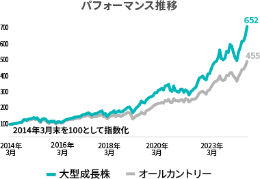 大型成長株はMSCI オール・カントリー・ワールド・インデックス 大型株グロース・インデックス、 オールカントリーはMSCI オール・カントリー・ワールド・インデックス(いずれも税引後配当込み、円換算ベース)。米ドルベースの月末より1日前のデータ(トータルリターン)を各月末の三菱UFJ銀行対顧客公示相場レートを用いて円換算。使用した指数の権利についてはページ末尾をご参照ください。