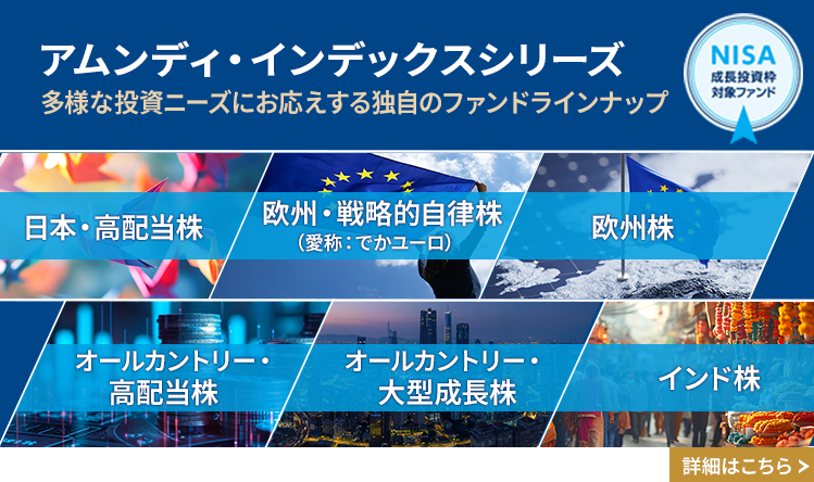 ・ 当ページは、アムンディ・ジャパン株式会社(「当社」)が日本の居住者の皆様を対象として設定・運用を行う国内投資信託の情報提供を目的として、当社が作成したものであり、法令等に基づく開示書類ではありません。また、当ページに含まれるいかなる特定の金融商品取引の勧誘を目的とするものではありません。 ・ 当ページは、信頼できると考えられる情報に基づいて作成しておりますが、その正確性、完全性を保証するものではありません。 ・ 当ページに記載されている運用実績等に関わる数値・グラフ等はあくまでも過去の実績であり、将来の運用成果等を示唆または保証するものではありません。また、手数料・税金等を考慮しておりませんので、実質的な投資成果を示すものではありません。 ・ 当ページに記載されている内容・数値・図表・意見・予測等は作成時点のものであり、将来の市場動向、運用成果を示唆・保証するものではなく、予告なしに変更される可能性があります。 ・ 投資信託は、株式など値動きのある有価証券(外貨建資産には、当該外貨の円に対する為替レートの変動による為替変動リスクもあります。)に投資しますので、基準価額は変動します。投資元本が保証されているものではありません。投資信託の基準価額の下落により、損失を被り投資元本を割り込むことがあります。投資信託の運用による損益はすべて投資者の皆さまに帰属します。 ・ 投資信託は預金、保険ではなく、預金保険機構および保険契約者保護機構の保護の対象ではありません。また、登録金融機関を通じてご購入いただいた投資信託は、投資者保護基金の保護の対象とはなりません。 ・ 投資信託のお取引に関しては、クーリング・オフの適用はありません。 ・ 投資信託の取得のお申込みにあたっては、販売会社よりお渡しする投資信託説明書(交付目論見書)の内容を必ずご確認のうえ、ご自身でご判断ください。