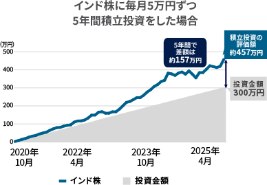 インド株はNifty50指数(配当込み、インドルピーベースの月末より1日前のデータ(トータルリターン)を各月末の三菱UFJ銀行対顧客公示相場レートを用いて円換算)。2025年10月現在の積立投資の評価額は、1万円未満を切り捨てて表示。使用した指数の権利についてはページ末尾をご参照ください。
