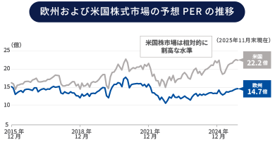 期間:2015年12月末~2025年11月末、月次。欧州:ストックス欧州600指数、米国:S&P500。使用した指数の権利はページ末尾をご覧ください。上記は過去の実績であり、将来の運用成果等を示唆または保証するものではありません。